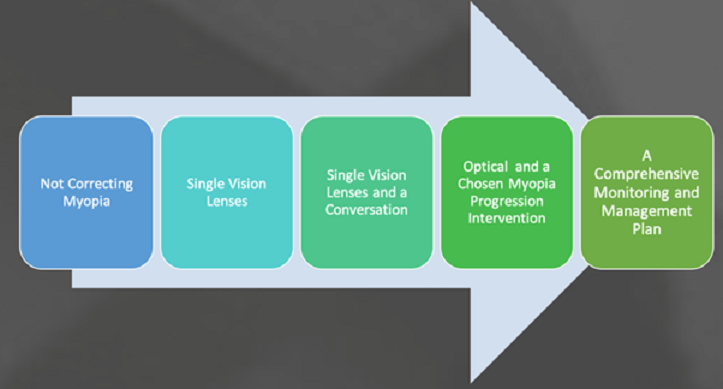 Passive alleviation of blurred vision symptoms is inappropriate. Providing an updated spectacle or contact lens prescription to a child with progressive myopia remains a necessary component of clinical care but should no longer be considered as the treatment for myopia, but representative of a treatment failure to prevent myopia progression.