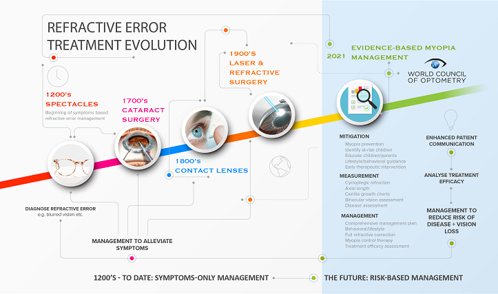 It has now become clear that correcting refractive error alone is not enough and the new clinical management guidelines for optometrists provide the impetus for a shift to comprehensive risk-based management. The mitigation, measurement and management principles defined in the WCO resolution outline an evolved minimum standard of evidence-based care appropriate to modern eye health needs.